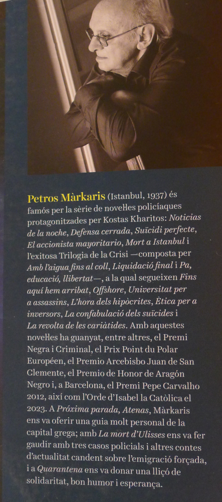 Petros Márkaris (Istanbul, 1937) és famós per la sèrie de novel·les policíaques protagonitzades per Kostas Kharitos: Noticias de la noche, Defensa cerrada, Suïcidi perfecte, El accionista mayoritario, Mort a Istanbul i l’exitosa Trilogia de la Crisi —composta per Amb l’aigua fins al coll, Liquidació final i Pa, educació, llibertat—, a la qual segueixen Fins aquí hem arribat, Offshore, Universitat per a assassins, L’hora dels hipòcrites,Ètica per a inversors, La confabulació dels suïcides i La revolta de les cariàtides. Amb aquestes novel·les ha guanyat, entre altres, el Premi Negra i Criminal, el Prix Point du Polar Européen, el Premio Arcebispo Juan de San Clemente, el Premio de Honor de Aragón Negro i, a Barcelona, el Premi Pepe Carvalho 2012, així com l’Orde d’Isabel la Catòlica el 2023. A Pròxima parada, Atenas, Márkaris ens va oferir una guia molt personal de la capital grega; amb La mort d’Ulisses ens va fer gaudir amb tres casos policials i altres contes d’actualitat candent sobre l’emigració forçada, i a Quarantena ens va donar una lliçó de solidaritat, bon humor i esperança.