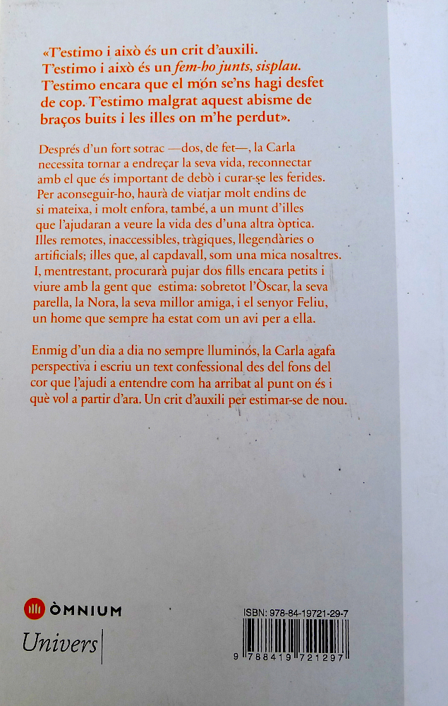 Després d’un fort sotrac —dos, de fet—, la Carla necessita tornar a endreçar la seva vida, reconnectar amb el que és important de debò i curar-se les ferides. Per aconseguir-ho, haurà de viatjar molt endins de si mateixa, i molt enfora, també, a un munt d’illes que l’ajudaran a veure la vida des d’una altra òptica. Illes remotes, inaccessibles, tràgiques, llegendàries o artificials; illes que, al capdavall, som una mica nosaltres. I, mentrestant, procurarà pujar dos fills encara petits i viure amb la gent que estima: sobretot l’Òscar, la seva parella, la Nora, la seva millor amiga, i el senyor Feliu, un home que sempre ha estat com un avi per a ella. Enmig d’un dia a dia no sempre lluminós, la Carla agafa perspectiva i escriu un text confessional des del fons del cor que l’ajudi a entendre com ha arribat al punt on és i què vol a partir d’ara. Un crit d’auxili per estimar-se de nou.